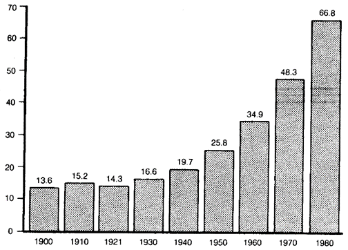 Gráfica 2. Recuentos censales de 1910 a 1980 (millones de habitantes)